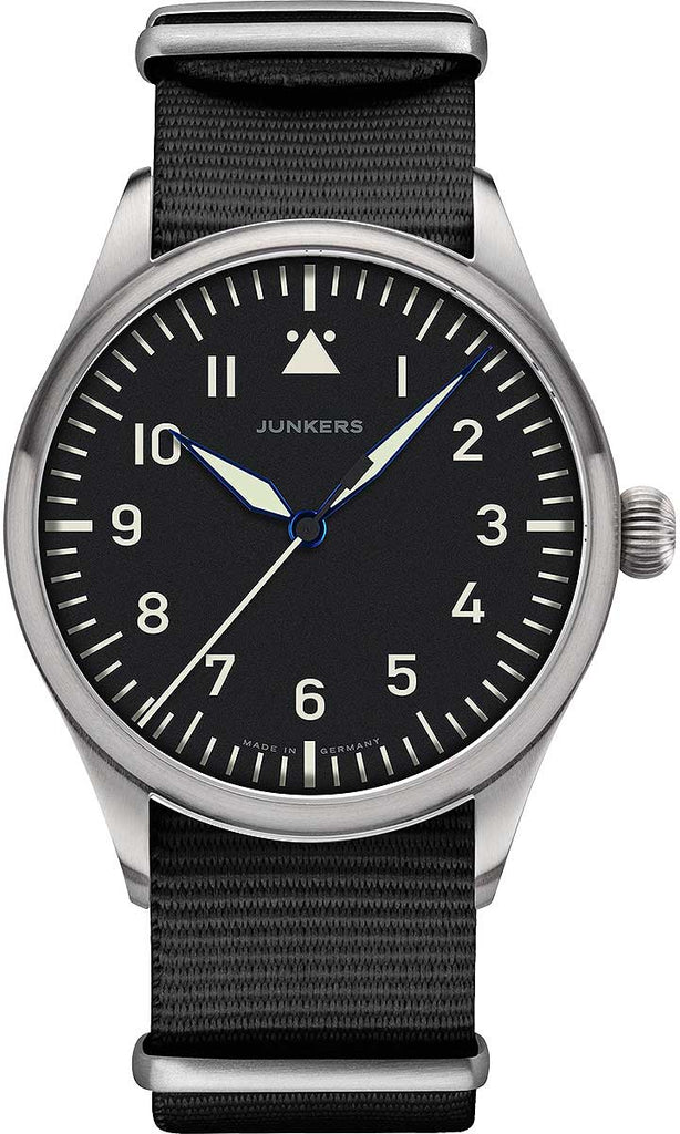 Crafted from high-quality 316L stainless steel and protected by scratch-resistant sapphire crystal, this watch is a robust companion for everyday wear. The black dial with luminous Arabic numerals and the durable NATO textile strap underscore the functional aviation character that has distinguished the Junkers brand for decades.