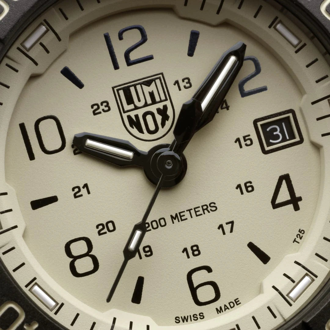 Equipped with a precise Swiss quartz movement and a durable 316L stainless steel case, this watch offers a constant, self-illuminating display for up to 25 years – the Luminox Light Technology (LLT). The scratch-resistant sapphire crystal reliably protects the beige dial from damage, while the impressive water resistance of 20 bar also qualifies it for demanding dives.