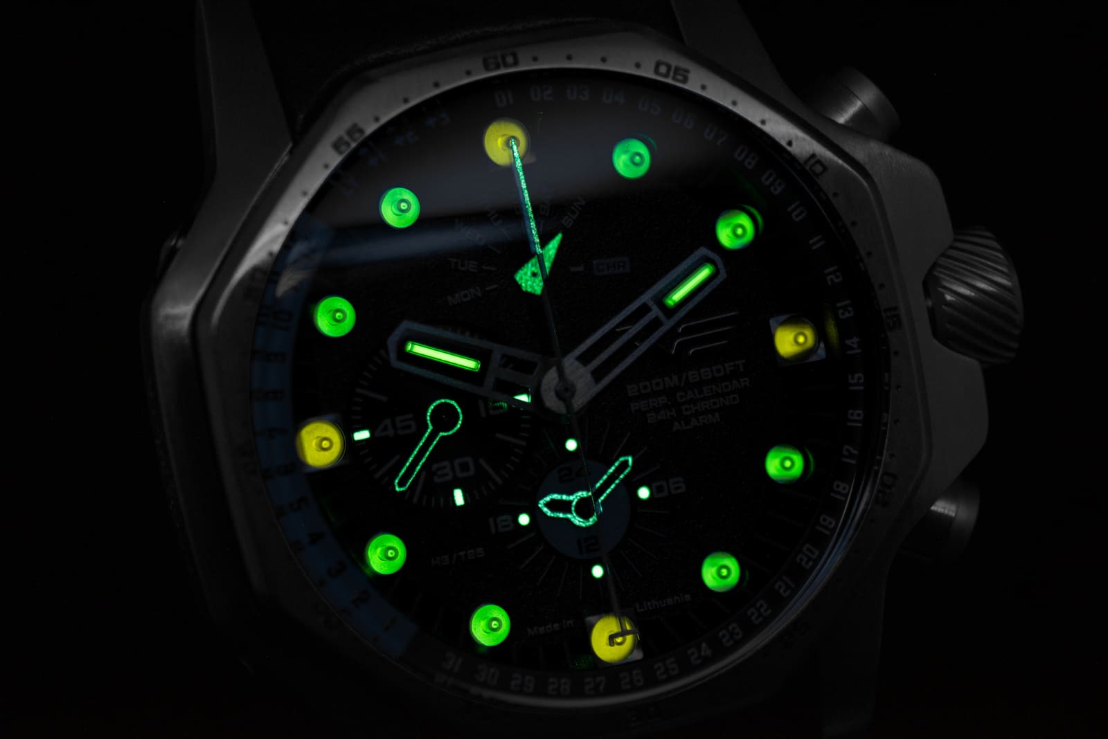 The heart of this watch is its precise quartz caliber, protected by an extremely robust K1 safety glass. Thanks to integrated tritium tubes, the time remains perfectly legible even in absolute darkness, without prior light charging.