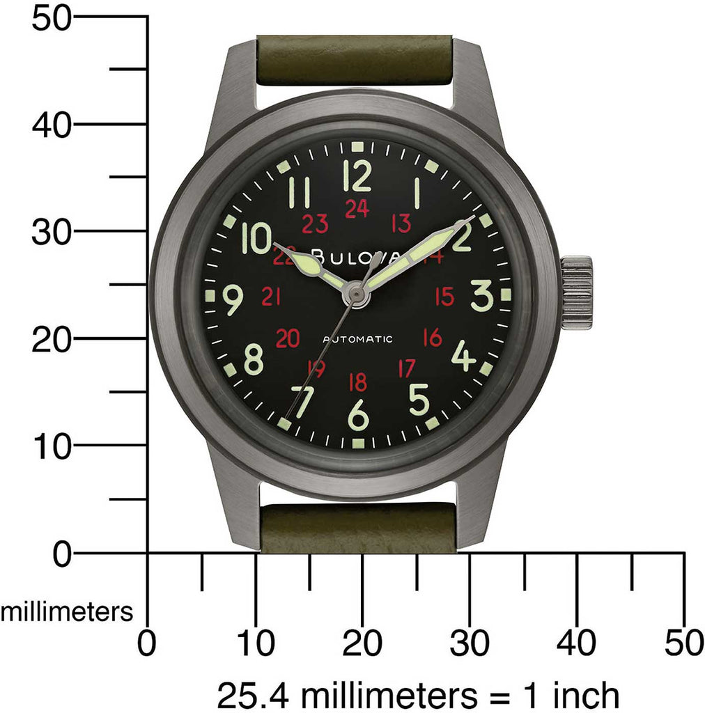 Cette montre appartient à la collection exclusive Bulova Hack, inspirée des montres militaires historiques et rendant hommage à l'héritage de Bulova en tant qu'innovateur dans l'horlogerie.
